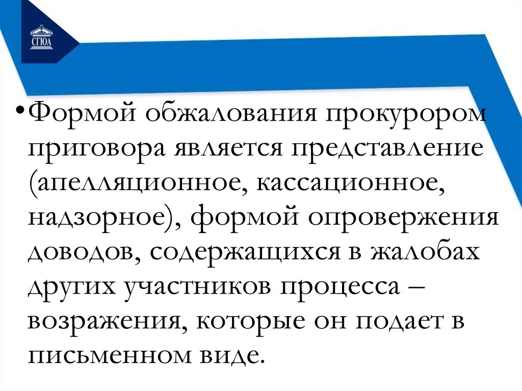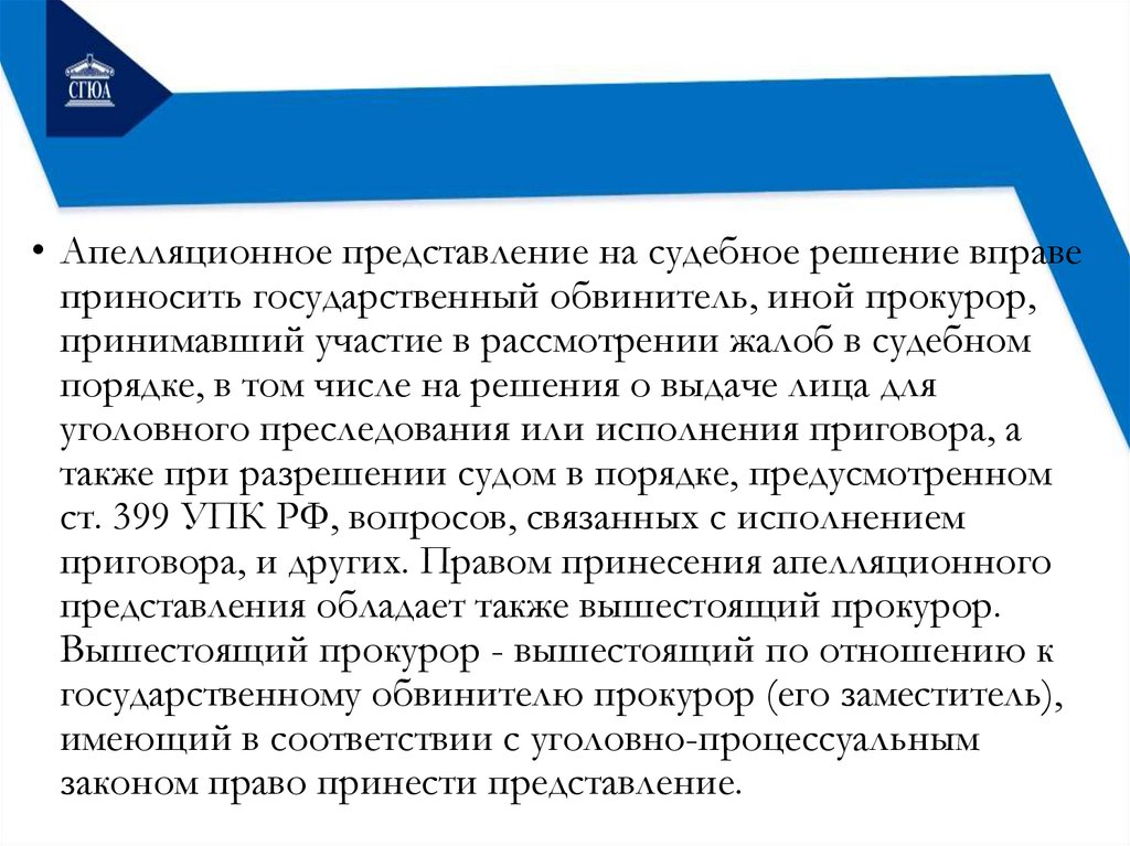 • Апелляционное представление на судебное решение вправеприносить государственный обвинитель, иной прокурор,