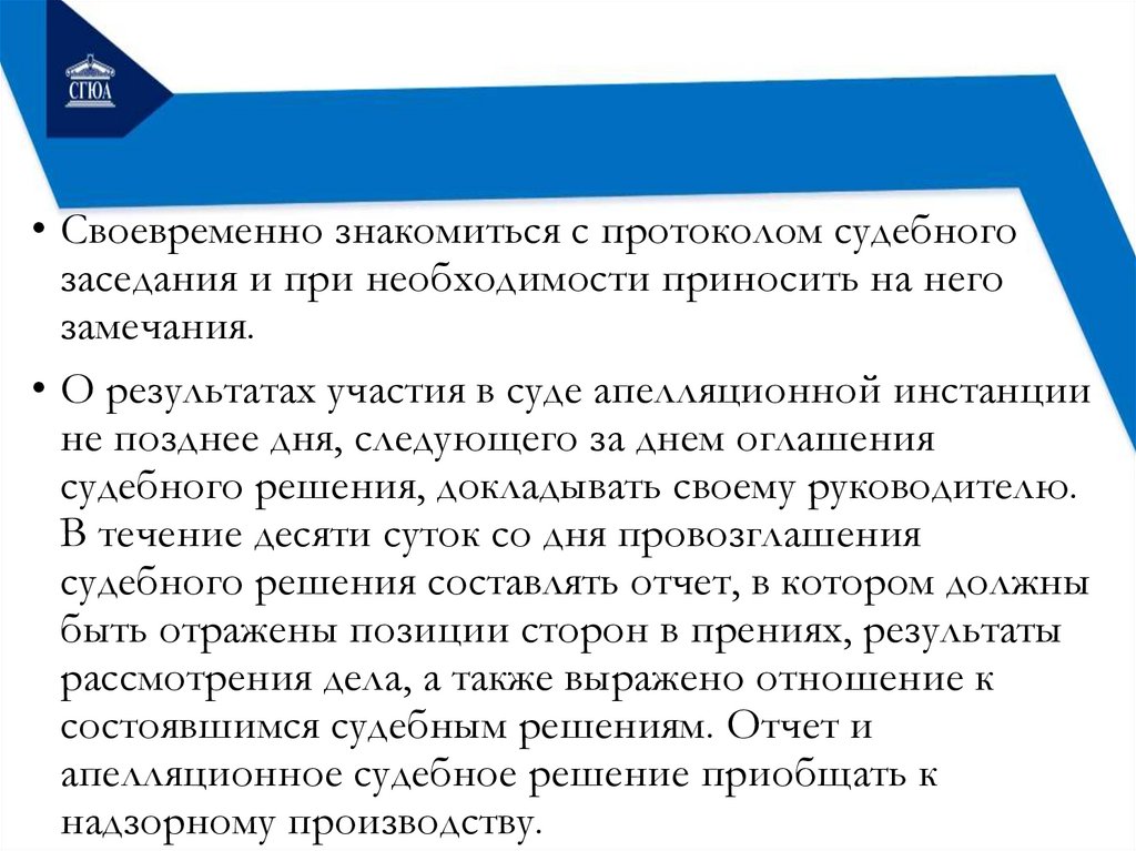 • Своевременно знакомиться с протоколом судебногозаседания и при необходимости приносить на него