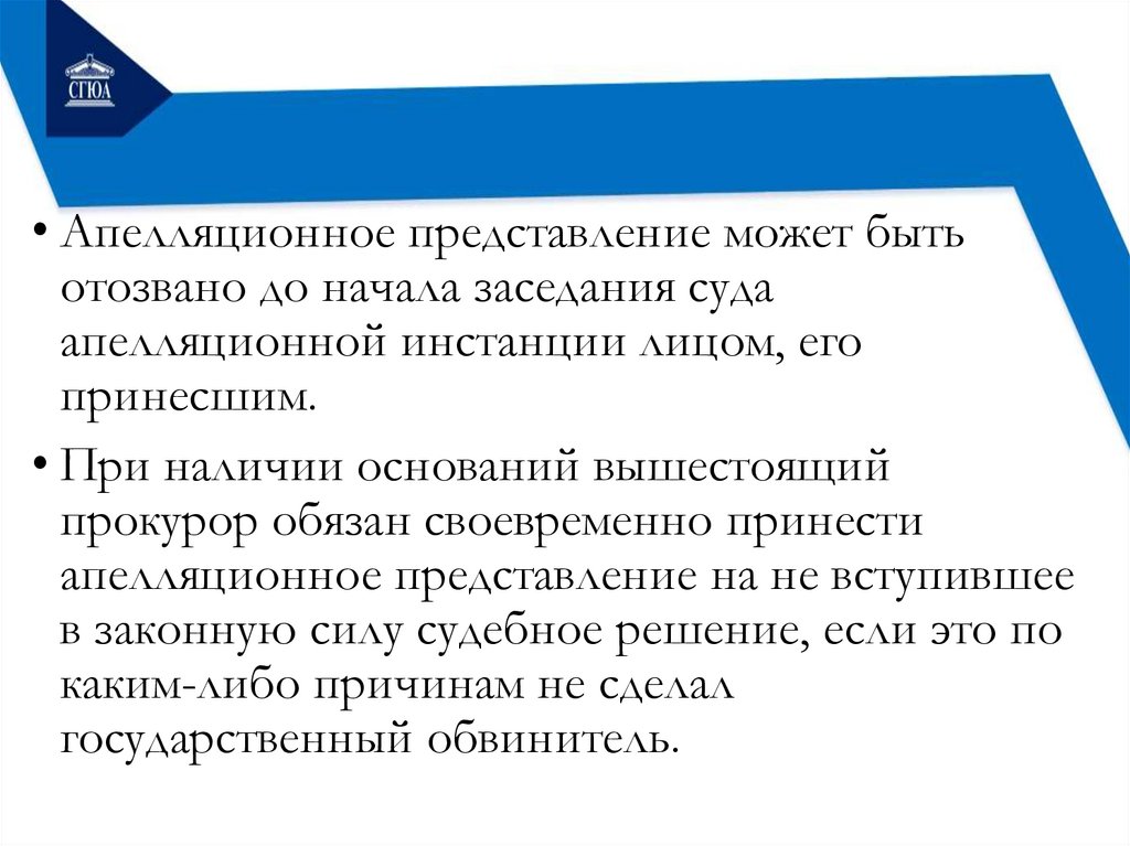 • Апелляционное представление может бытьотозвано до начала заседания суда