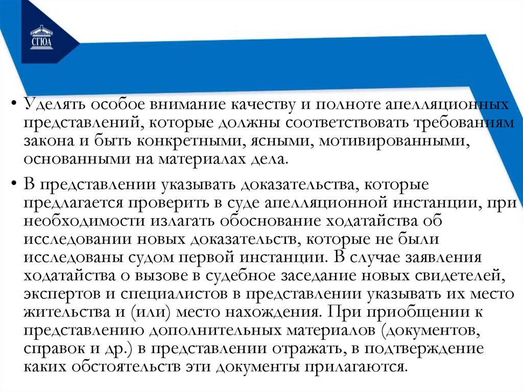 • Уделять особое внимание качеству и полноте апелляционныхпредставлений, которые должны соответствовать требованиям