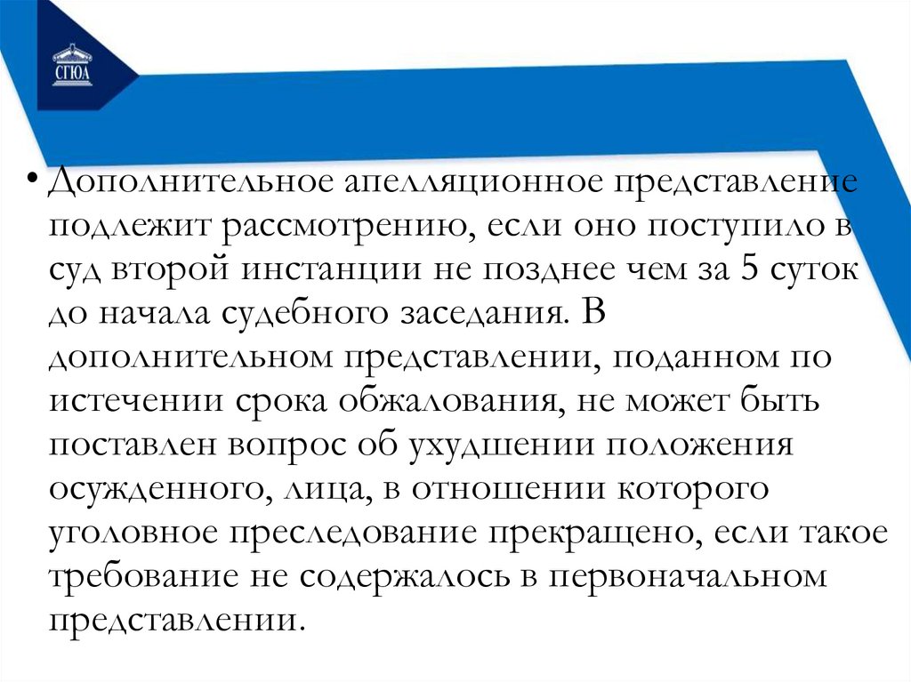 • Дополнительное апелляционное представлениеподлежит рассмотрению, если оно поступило в