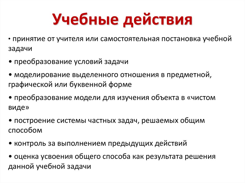 Учебные действия• принятие от учителя или самостоятельная постановка учебной