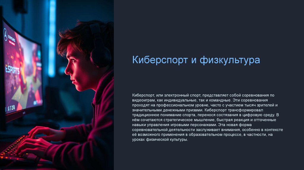 Киберспорт и физкультураКиберспорт, или электронный спорт, представляет собой соревнования по