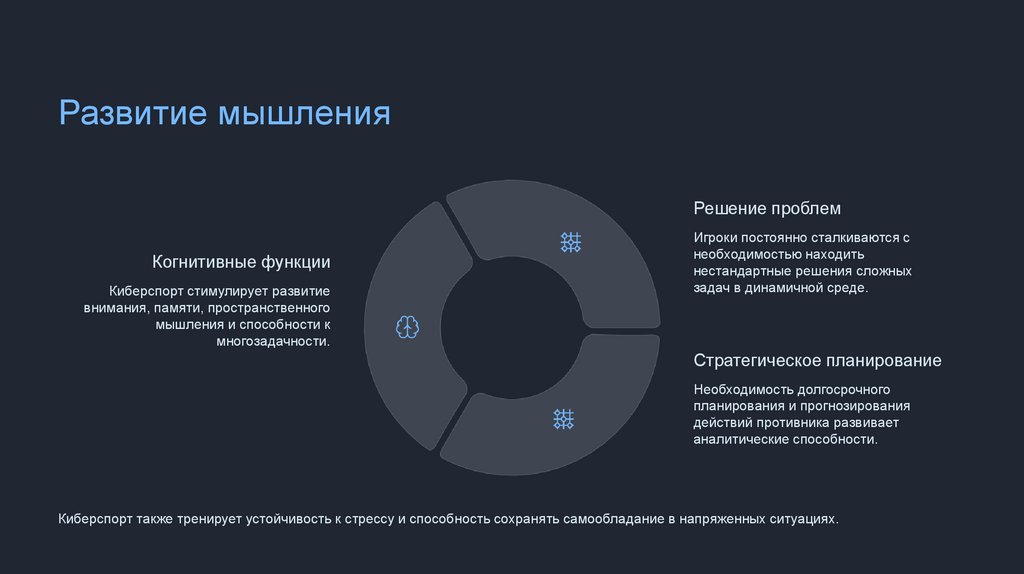 Киберспорт также тренирует устойчивость к стрессу и способность сохранять самообладание в напряженных ситуациях.