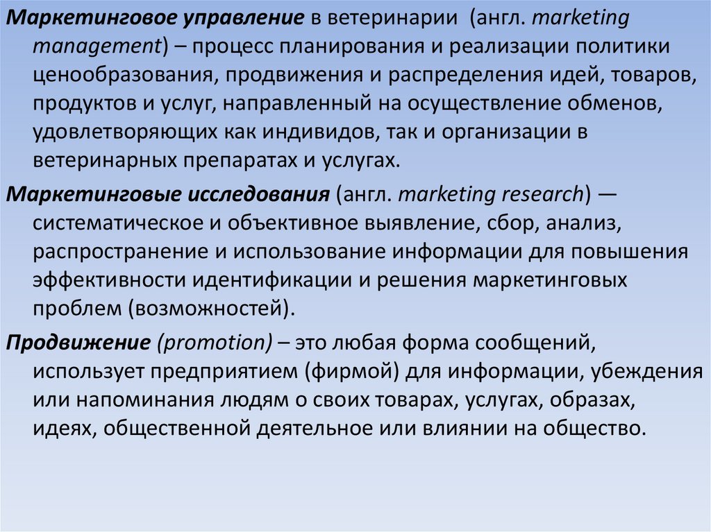 Маркетинговое управление в ветеринарии (англ. marketingmanagement) – процесс планирования и реализации политики