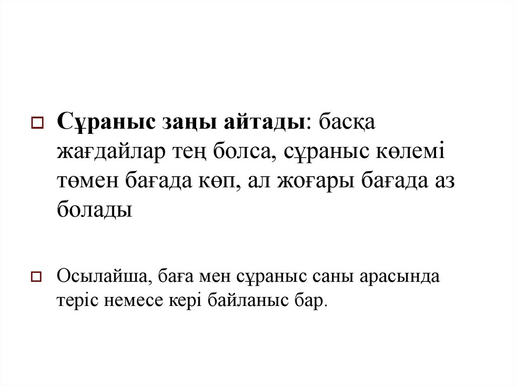 Сұраныс заңы айтады: басқажағдайлар тең болса, сұраныс көлемі