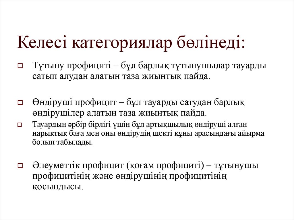 Келесі категориялар бөлінеді:Тұтыну профициті – бұл барлық тұтынушылар тауарды