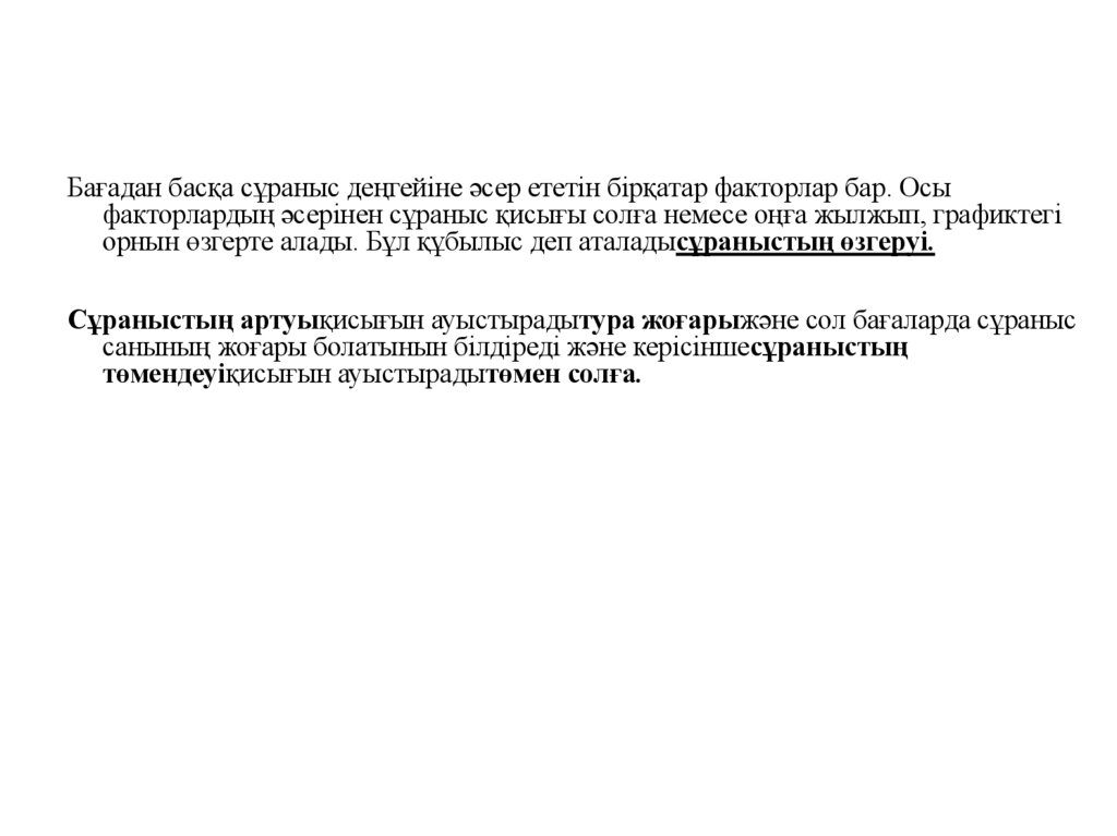 Бағадан басқа сұраныс деңгейіне әсер ететін бірқатар факторлар бар. Осыфакторлардың әсерінен сұраныс қисығы солға немесе оңға жылжып, графиктегі