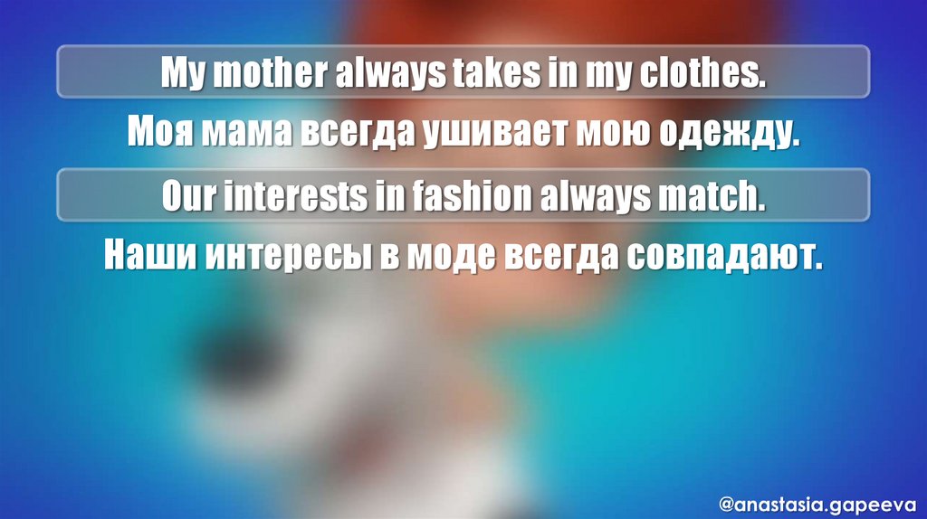 My mother always takes in my clothes.Моя мама всегда ушивает мою одежду.