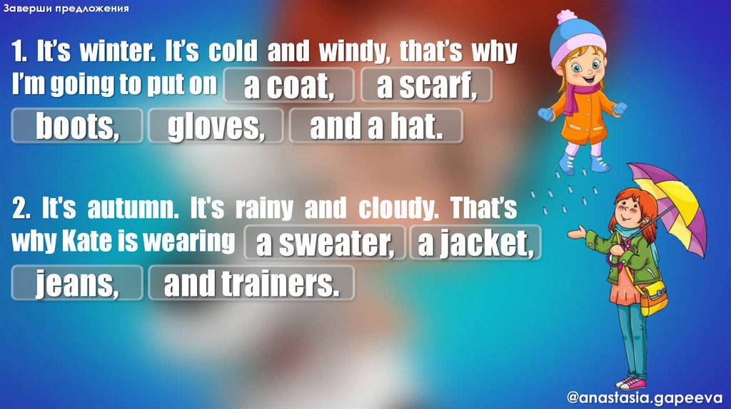 Заверши предложения1. It’s winter. It’s cold and windy, that’s why