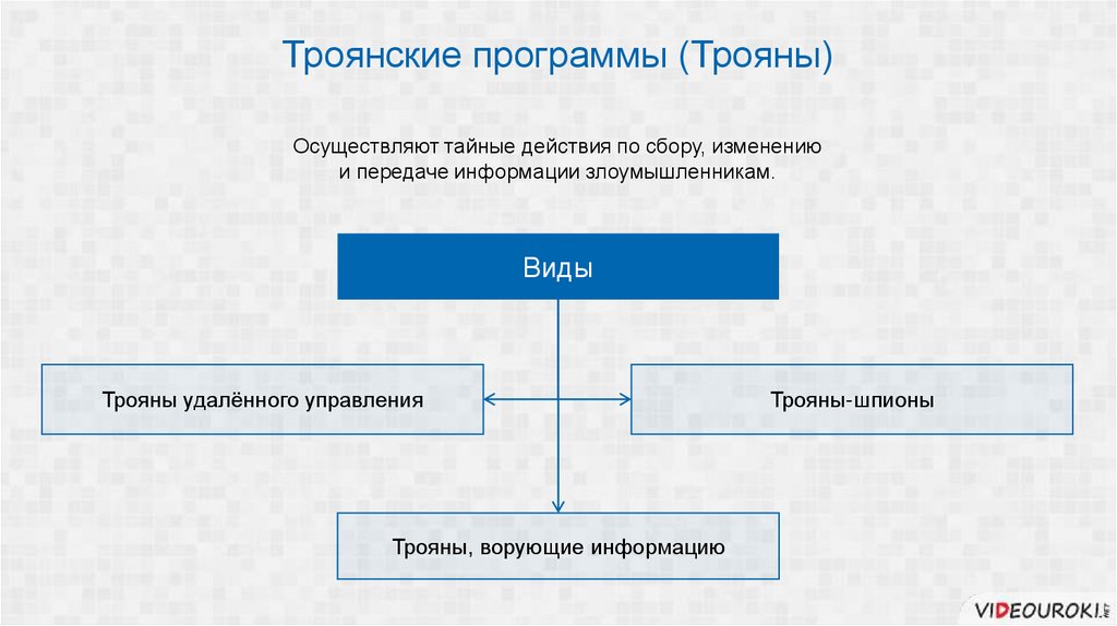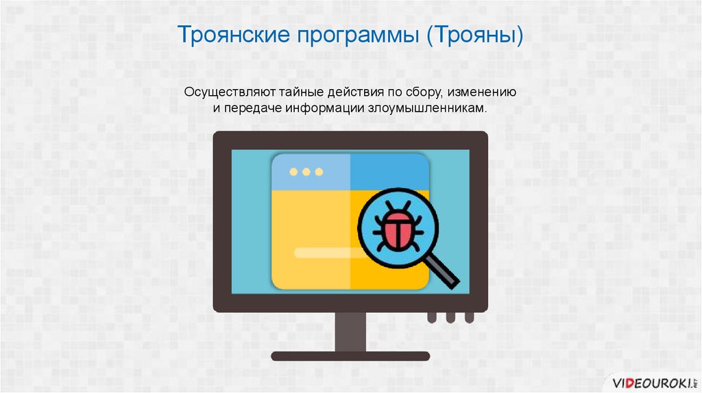 Троянские программы (Трояны)Осуществляют тайные действия по сбору, изменению