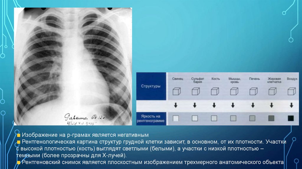 Изображение на р-грамах является негативнымРентгенологическая картина структур грудной клетки зависит, в основном, от их плотности. Участки