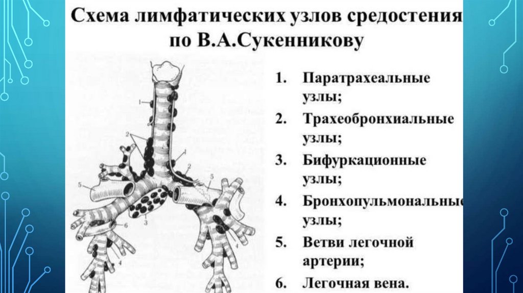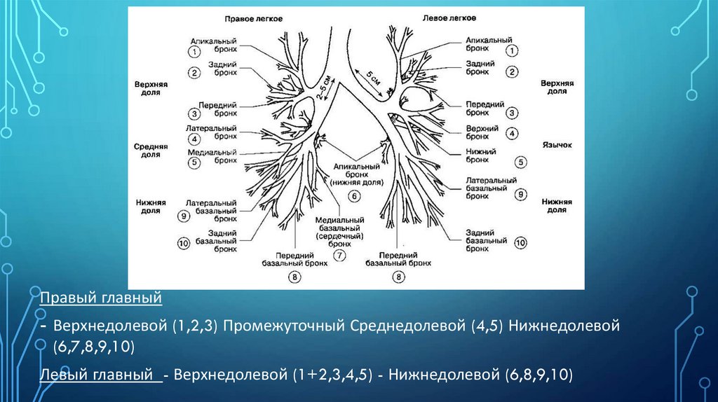 Рентгенограмма грудной клетки в прямой проекции1 Трахея 2 Правый главный бронх 3 Левый главный бронх 4 Лопатки 5 Ключица 6 рукоятка грудины 7