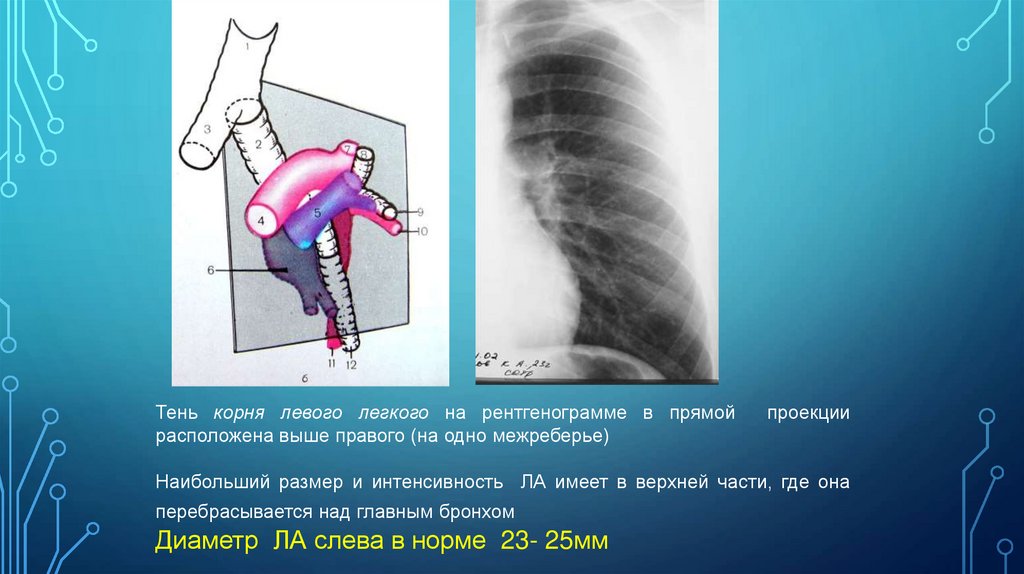 7 вена Azygos 8 Дуга аорты 9 Левая легочная артерия 10 Верхние левые кардиальные границы, ушко