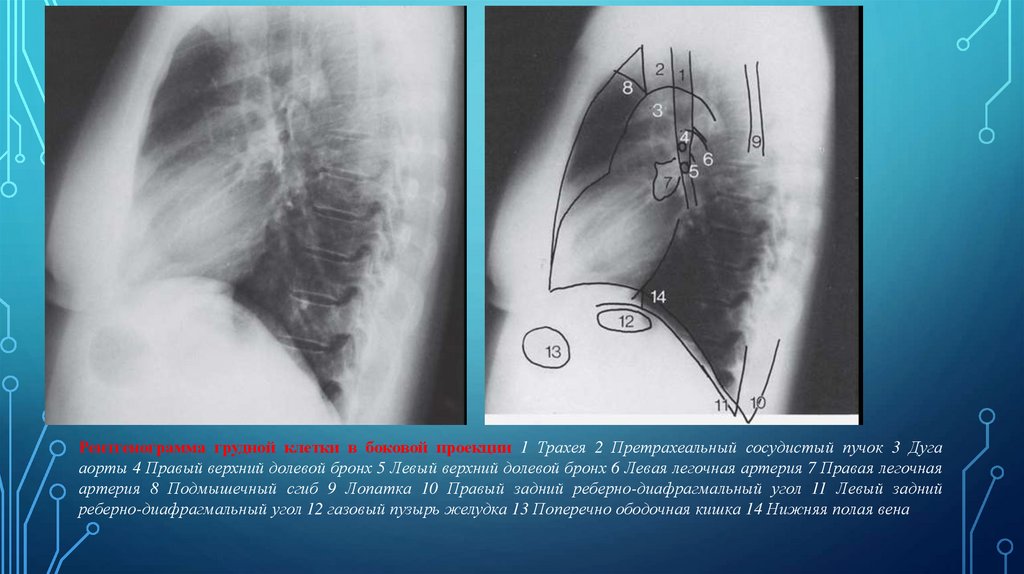 Рентгенограмма грудной клетки в боковой проекции 1 Трахея 2 Претрахеальный сосудистый пучок 3 Дугааорты 4 Правый верхний долевой бронх 5 Левый верхний долевой бронх 6 Левая легочная артерия 7 Правая легочная