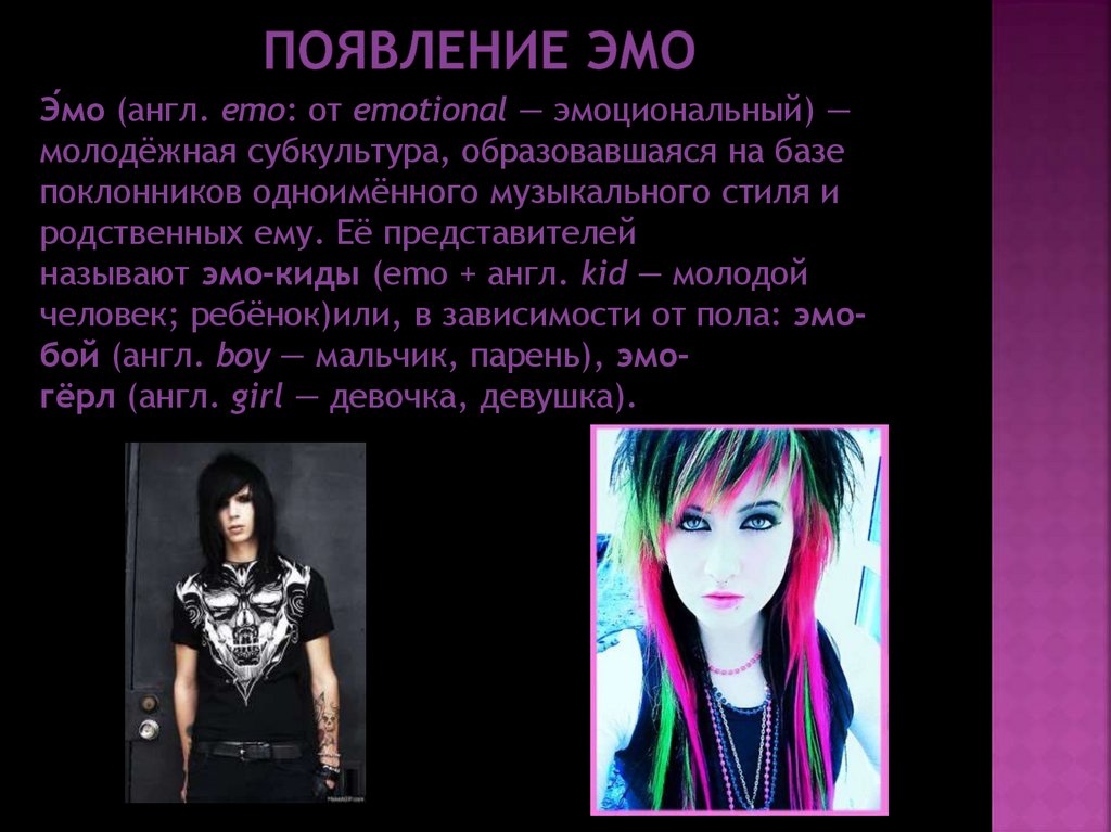 человек; ребёнок)или, в зависимости от пола: эмобой (англ. boy — мальчик, парень), эмогёрл (англ. girl — девочка, девушка).