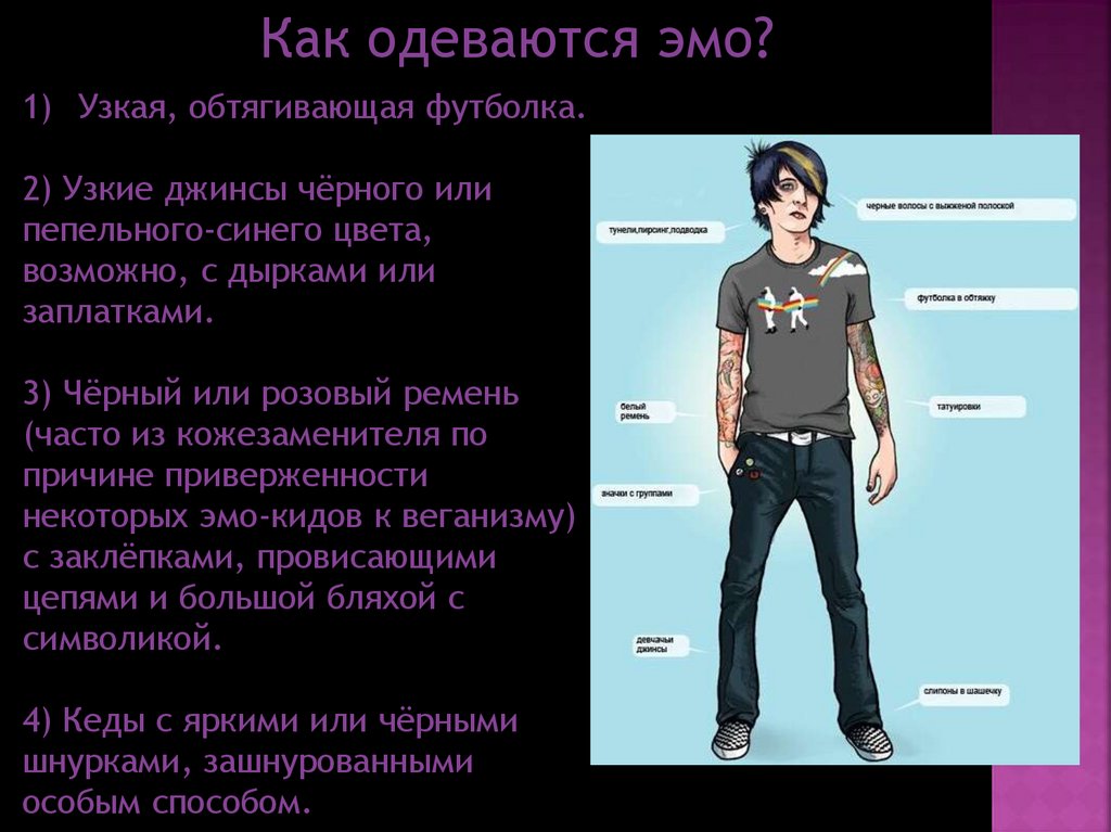 Как одеваются эмо?1) Узкая, обтягивающая футболка.