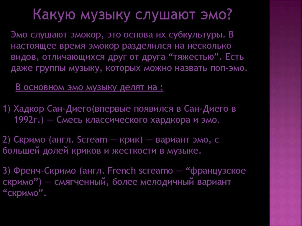 Какую музыку слушают эмо?Эмо слушают эмокор, это основа их субкультуры. В