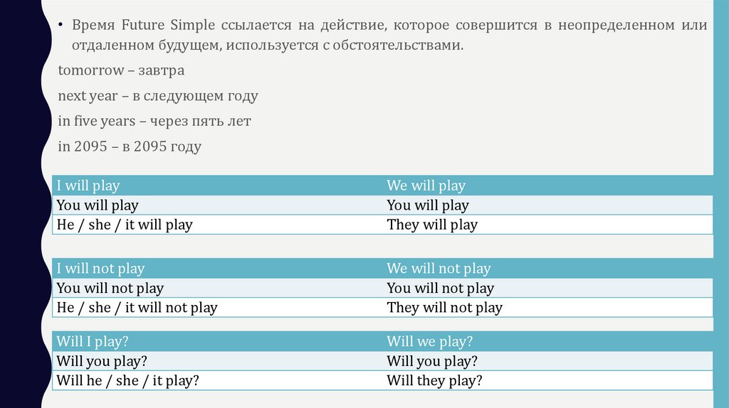• Время Future Simple ссылается на действие, которое совершится в неопределенном илиотдаленном будущем, используется с обстоятельствами.