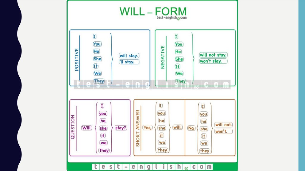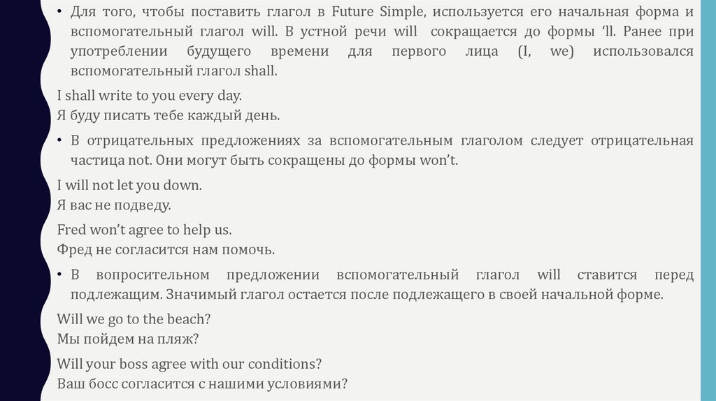 • Для того, чтобы поставить глагол в Future Simple, используется его начальная форма ивспомогательный глагол will. В устной речи will сокращается до формы ‘ll. Ранее при