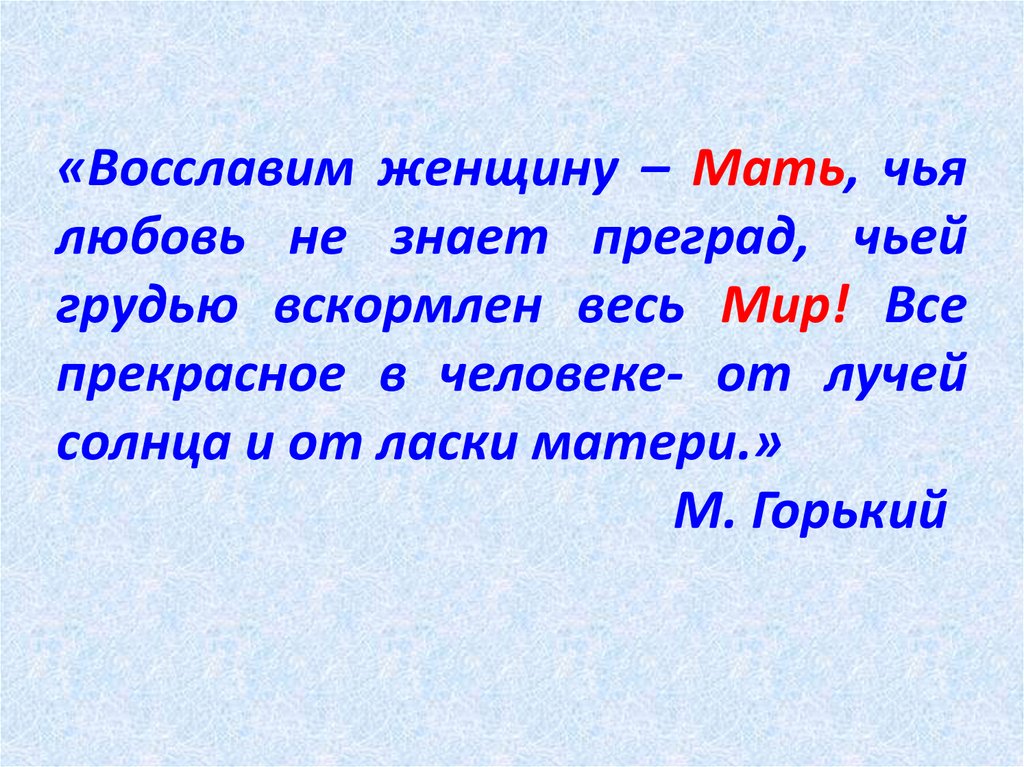 «Восславим женщину – Мать, чьялюбовь не знает преград, чьей