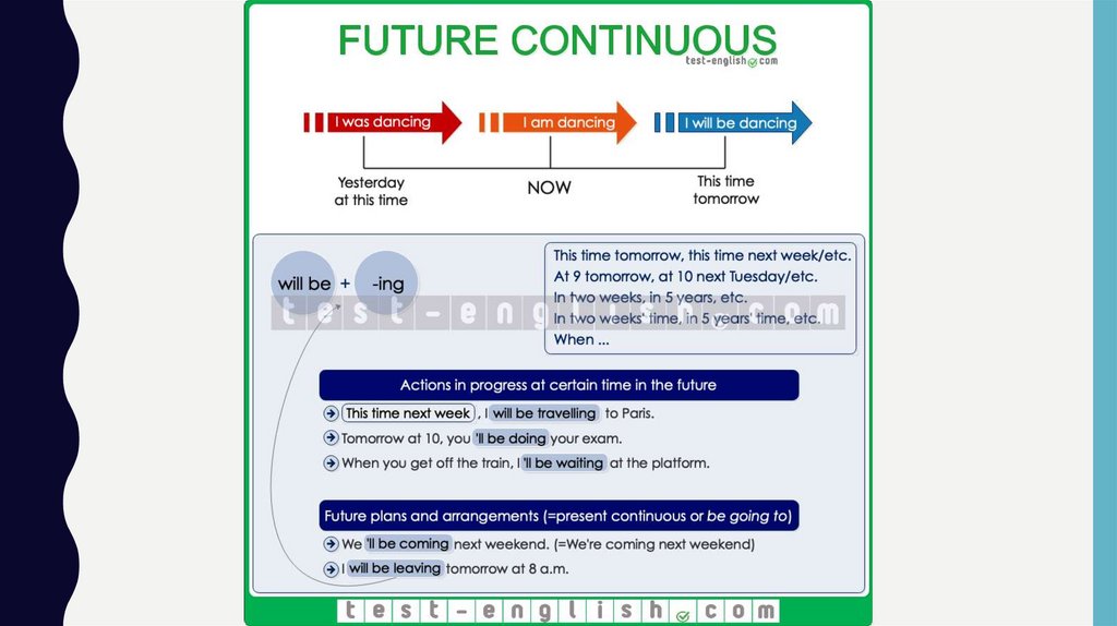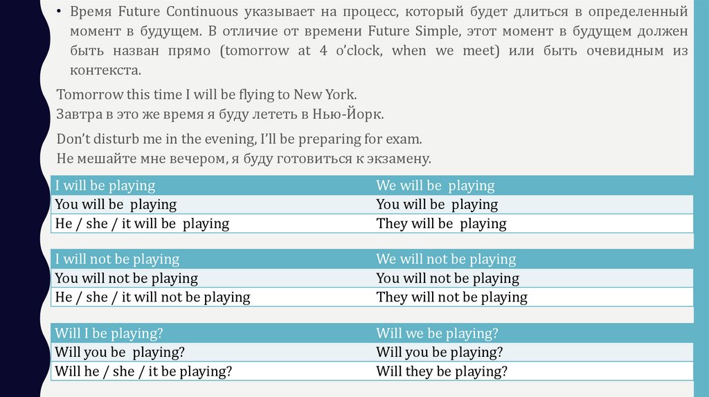• Время Future Continuous указывает на процесс, который будет длиться в определенныймомент в будущем. В отличие от времени Future Simple, этот момент в будущем должен