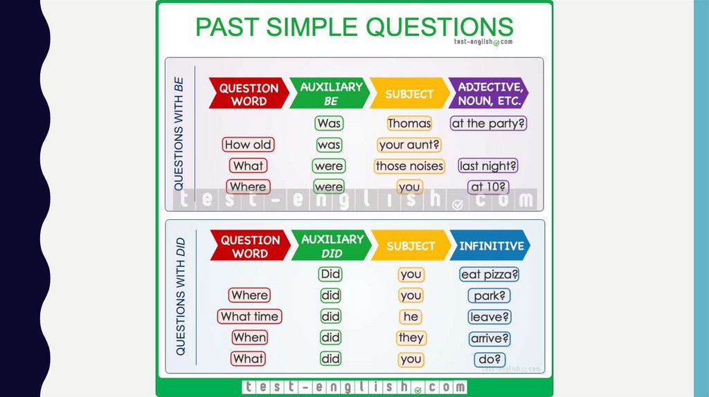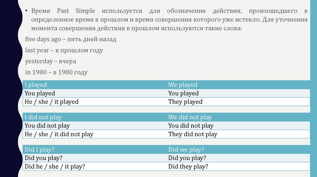 • Время Past Simple используется для обозначения действия, произошедшего вопределенное время в прошлом и время совершения которого уже истекло. Для уточнения