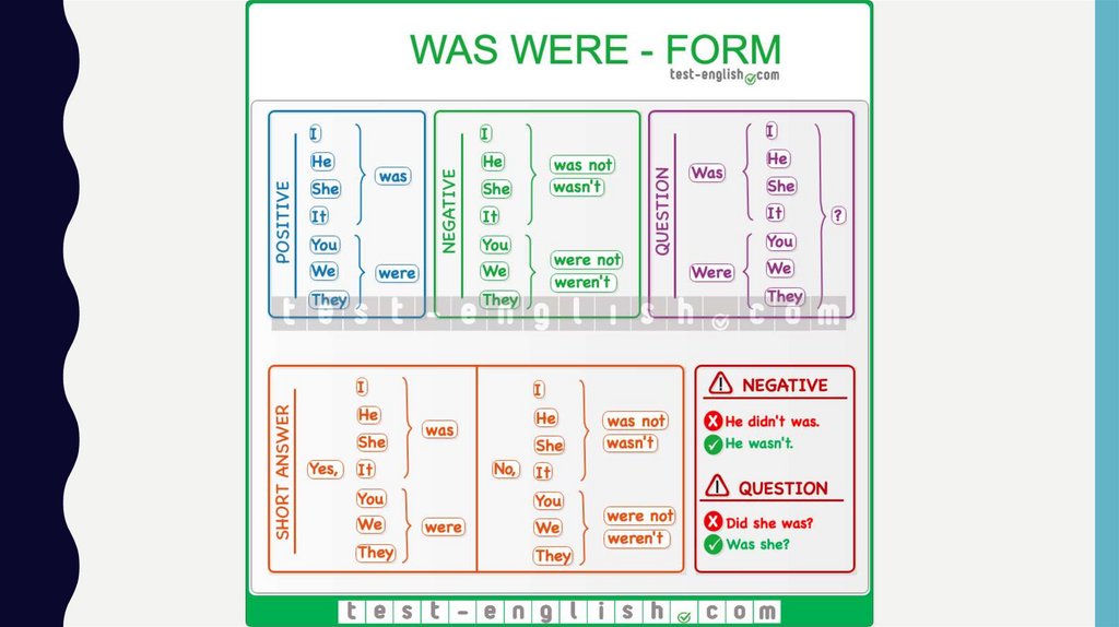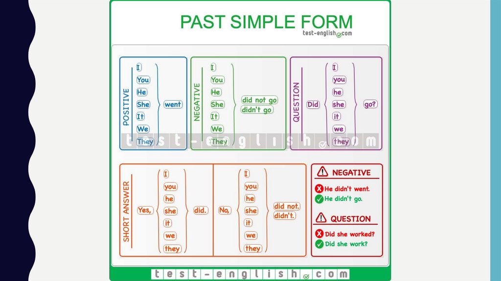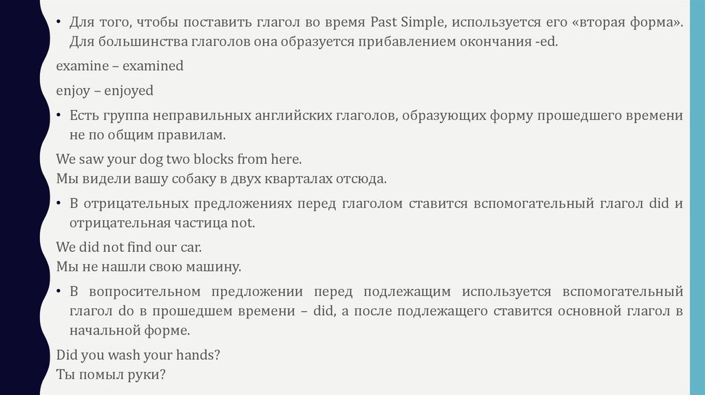 • Для того, чтобы поставить глагол во время Past Simple, используется его «вторая форма».Для большинства глаголов она образуется прибавлением окончания -ed.