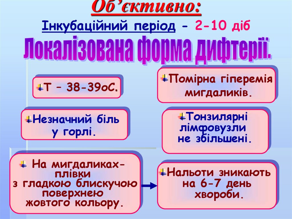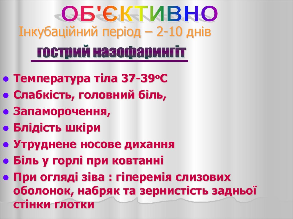 Об’єктивно:Інкубаційний період - 2-10 діб