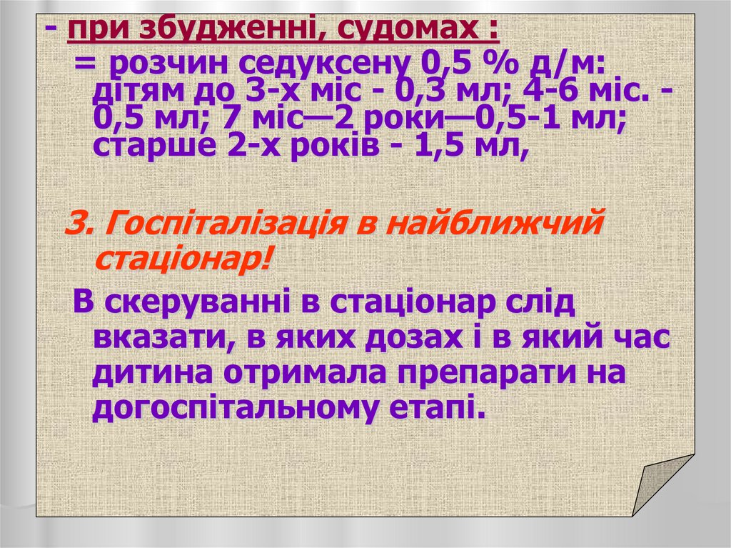 - при збудженні, судомах := розчин седуксену 0,5 % д/м: