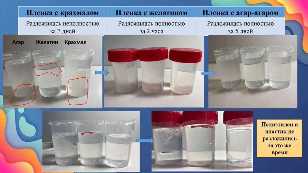 В ходе работы:1.Созданы 14 биоразлагаемых пленок в домашних условиях из