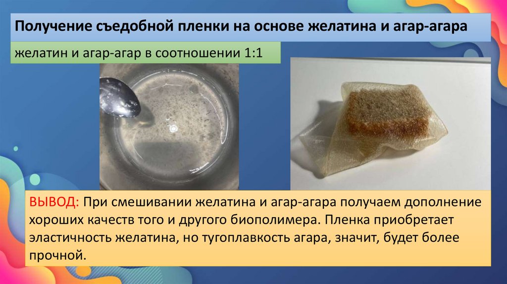 2. Цель работы –получение и исследование свойств съедобных пищевых пленок из доступных в домашних условиях ингредиентов