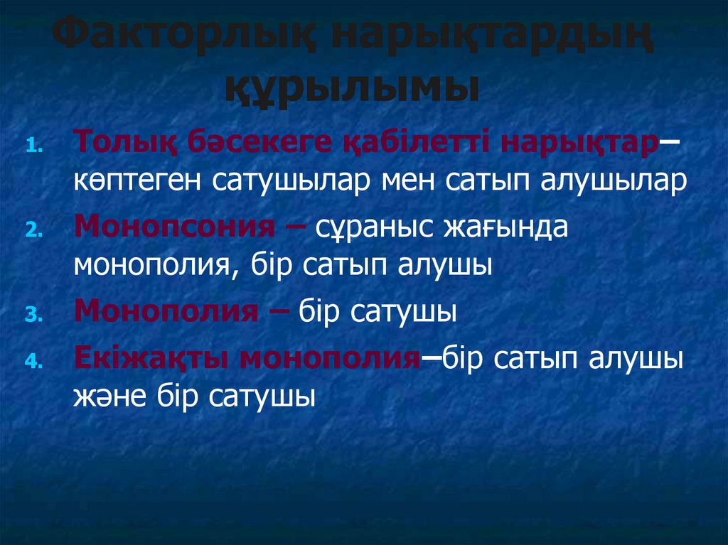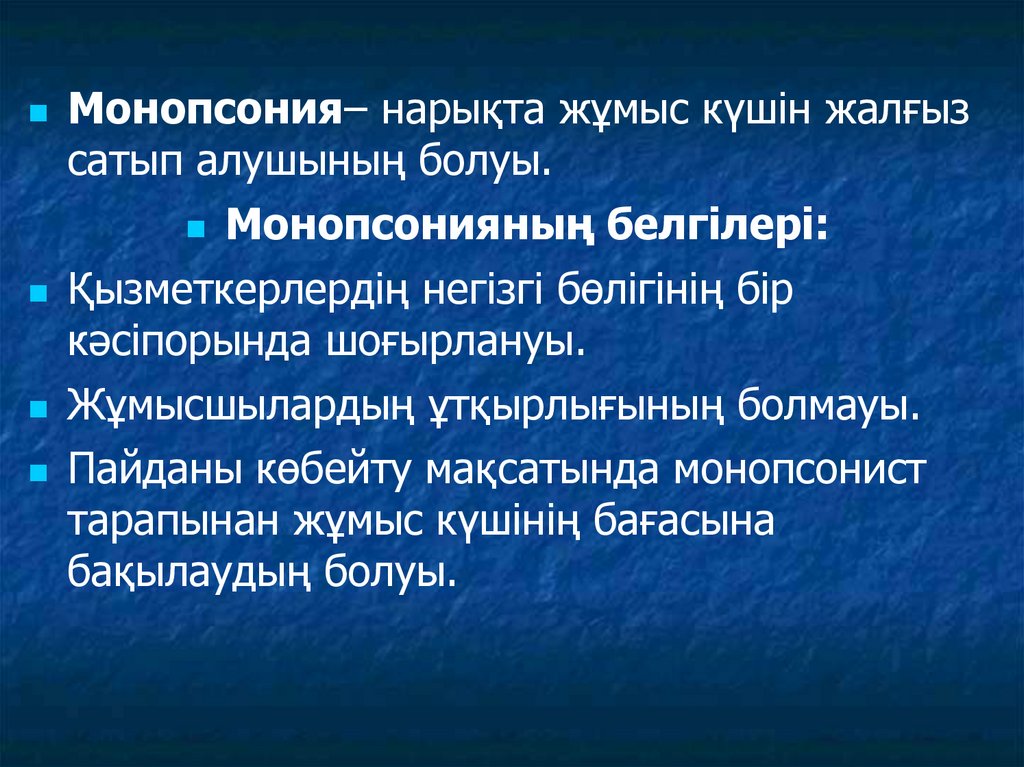 Монопсония– нарықта жұмыс күшін жалғызсатып алушының болуы.