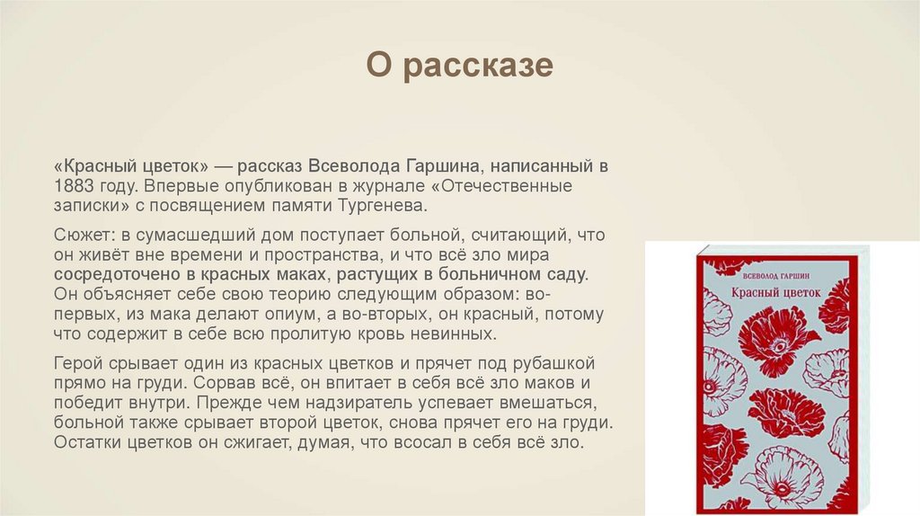 О рассказе«Красный цветок» — рассказ Всеволода Гаршина, написанный в