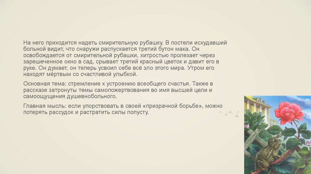 На него приходится надеть смирительную рубашку. В постели исхудавшийбольной видит, что снаружи распускается третий бутон мака. Он
