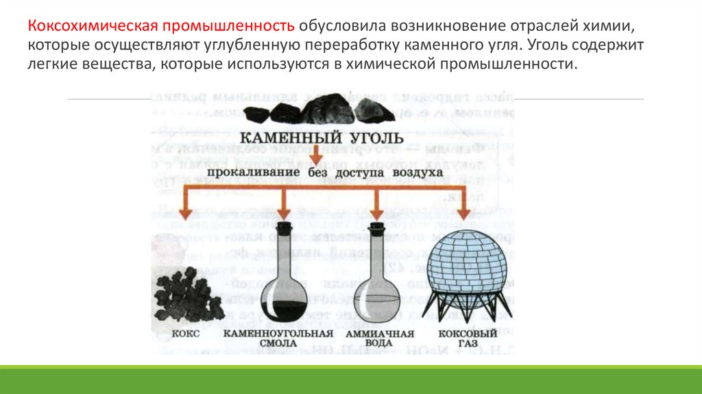 Коксохимическая промышленность обусловила возникновение отраслей химии,которые осуществляют углубленную переработку каменного угля. Уголь содержит