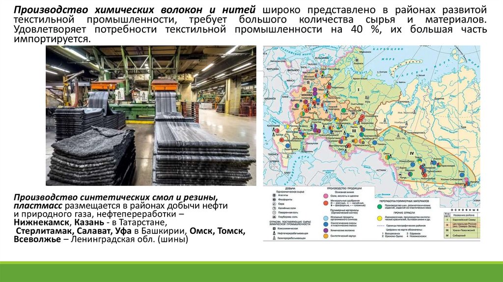 Производство химических волокон и нитей широко представлено в районах развитойтекстильной промышленности, требует большого количества сырья и материалов.
