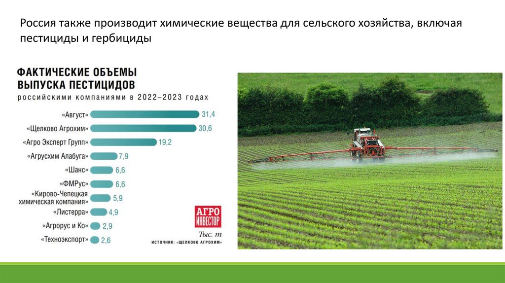 Россия также производит химические вещества для сельского хозяйства, включаяпестициды и гербициды