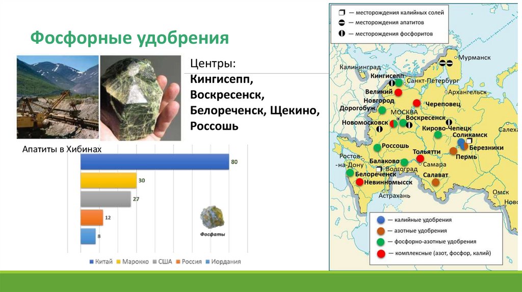 Добыча солей, фосфоритов, апатитов. У мест добычи сырья.