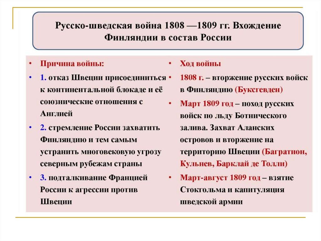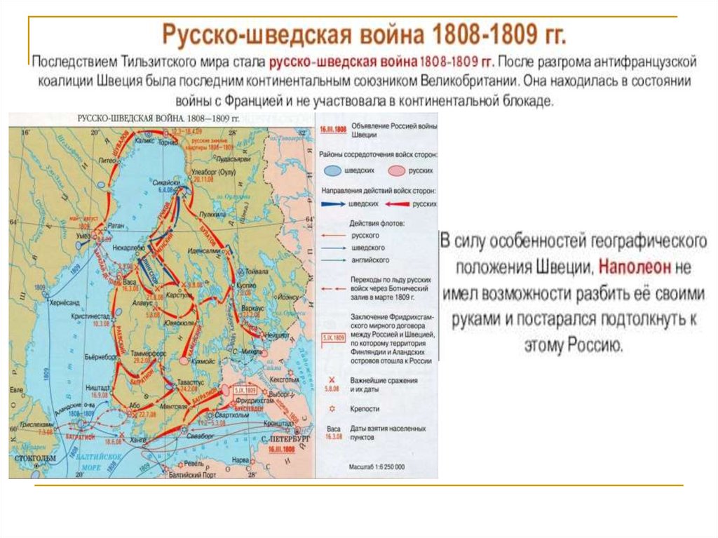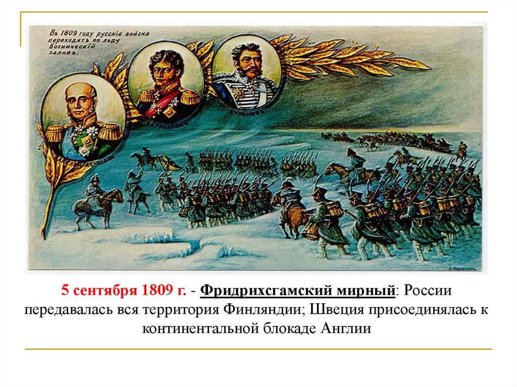 5 сентября 1809 г. - Фридрихсгамский мирный: Россиипередавалась вся территория Финляндии; Швеция присоединялась к