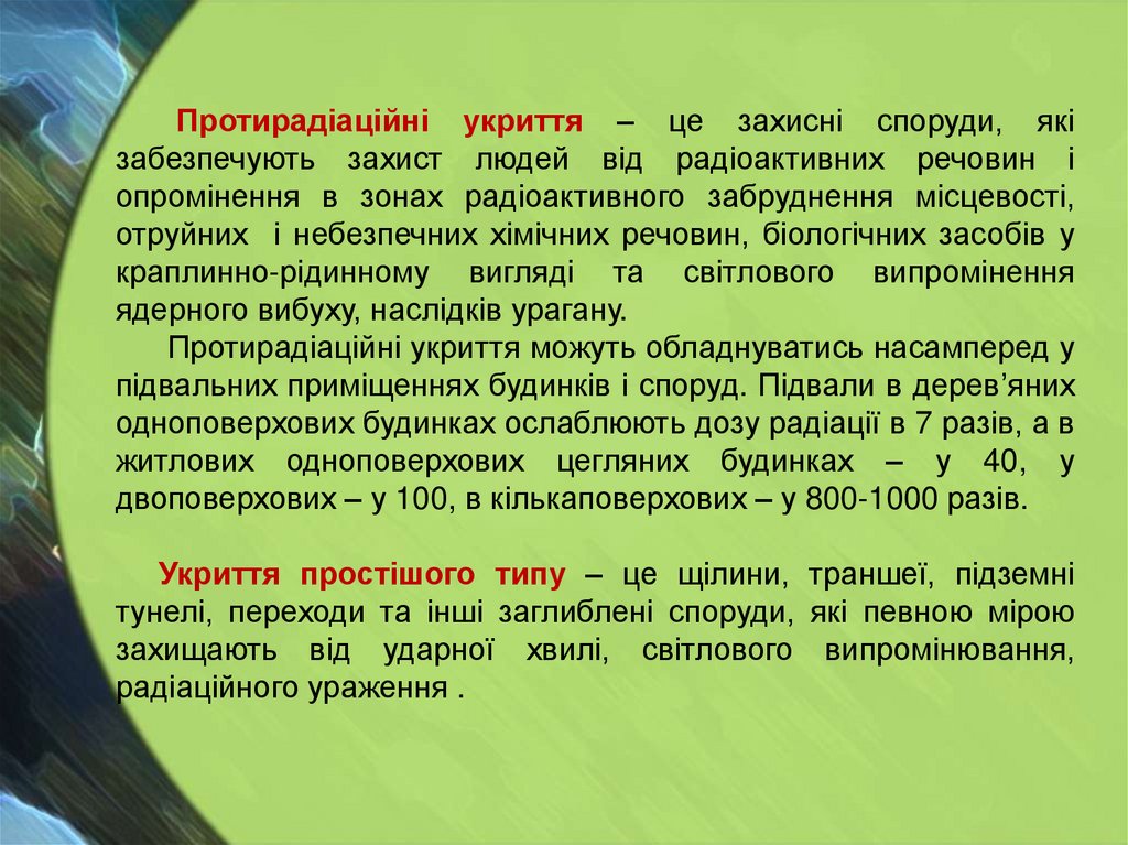 Протирадіаційні укриття – це захисні споруди, якізабезпечують захист людей від радіоактивних речовин і