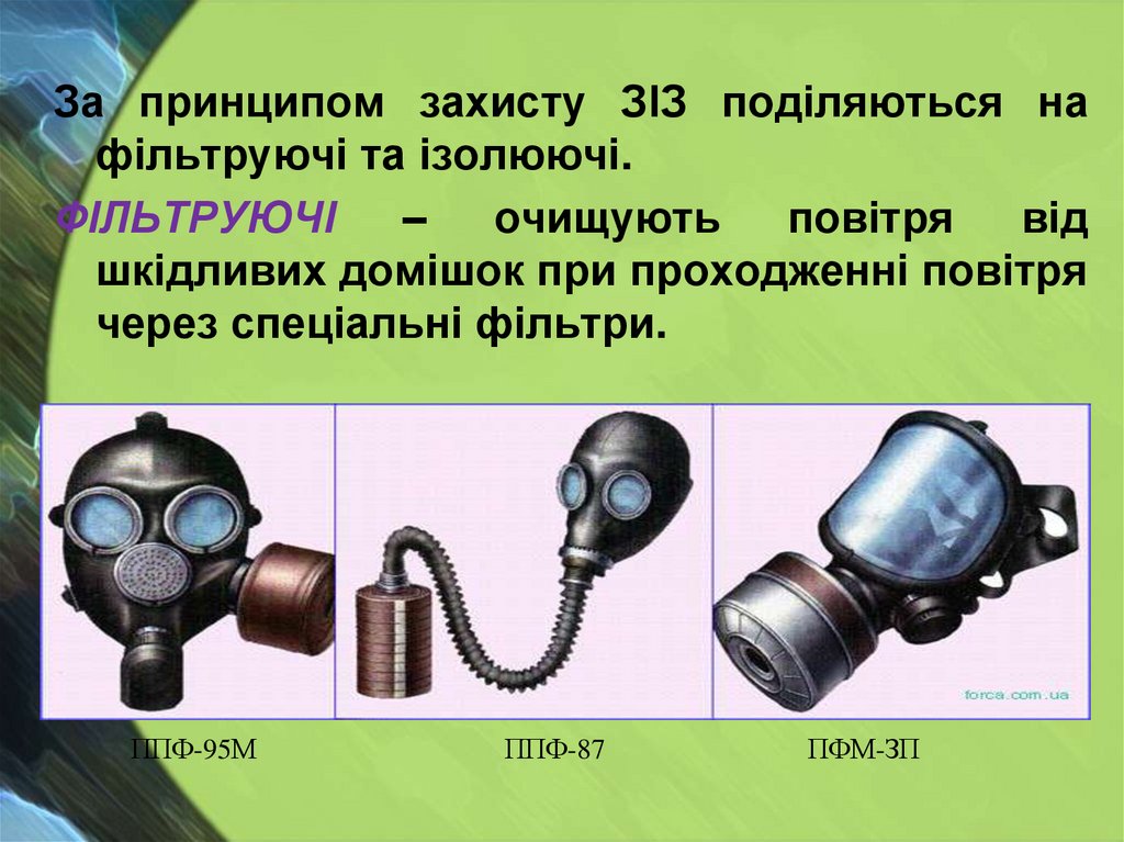 За принципом захисту ЗІЗ поділяються нафільтруючі та ізолюючі.