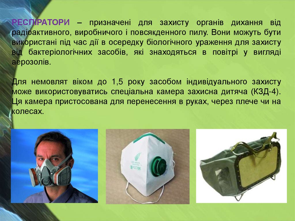РЕСПІРАТОРИ – призначені для захисту органів дихання відрадіоактивного, виробничого і повсякденного пилу. Вони можуть бути