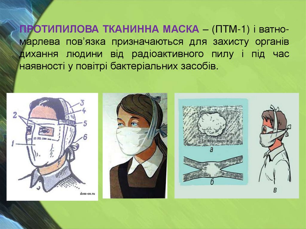 ПРОТИПИЛОВА ТКАНИННА МАСКА – (ПТМ-1) і ватномарлева пов’язка призначаються для захисту органівдихання людини від радіоактивного пилу і під час