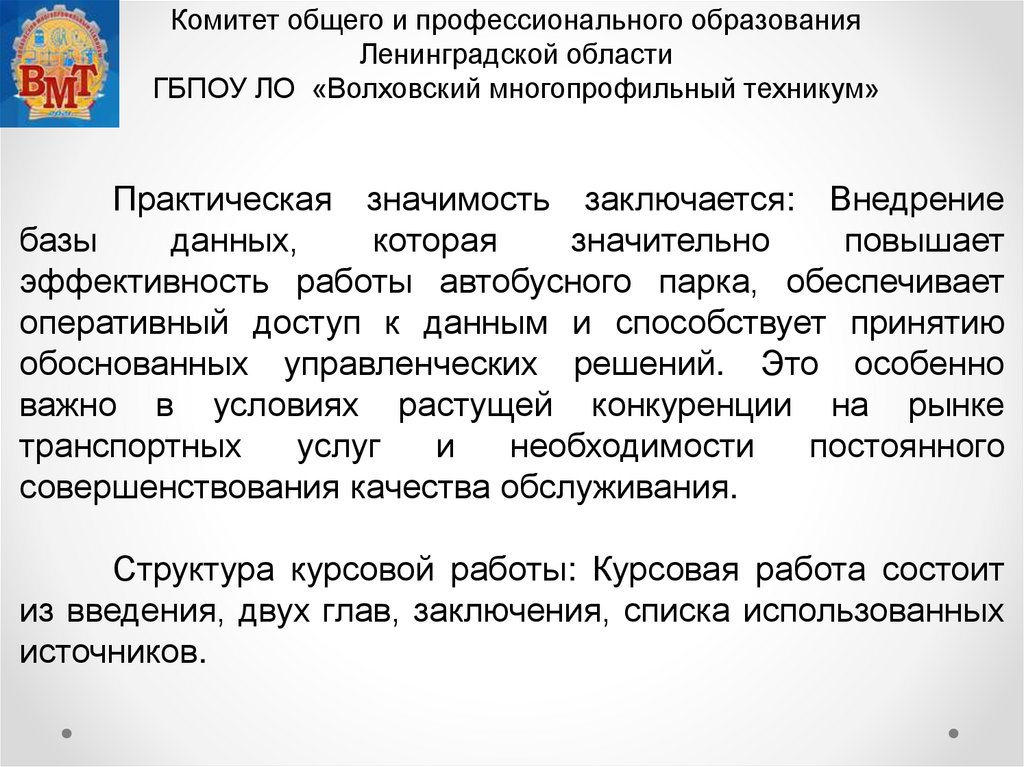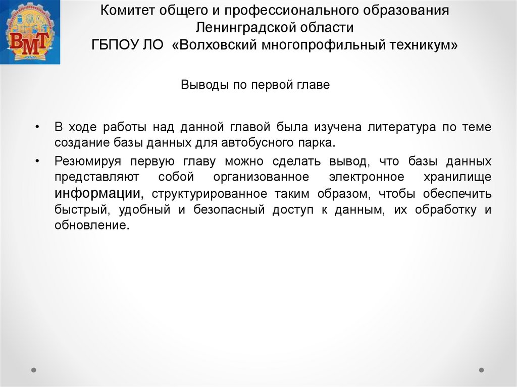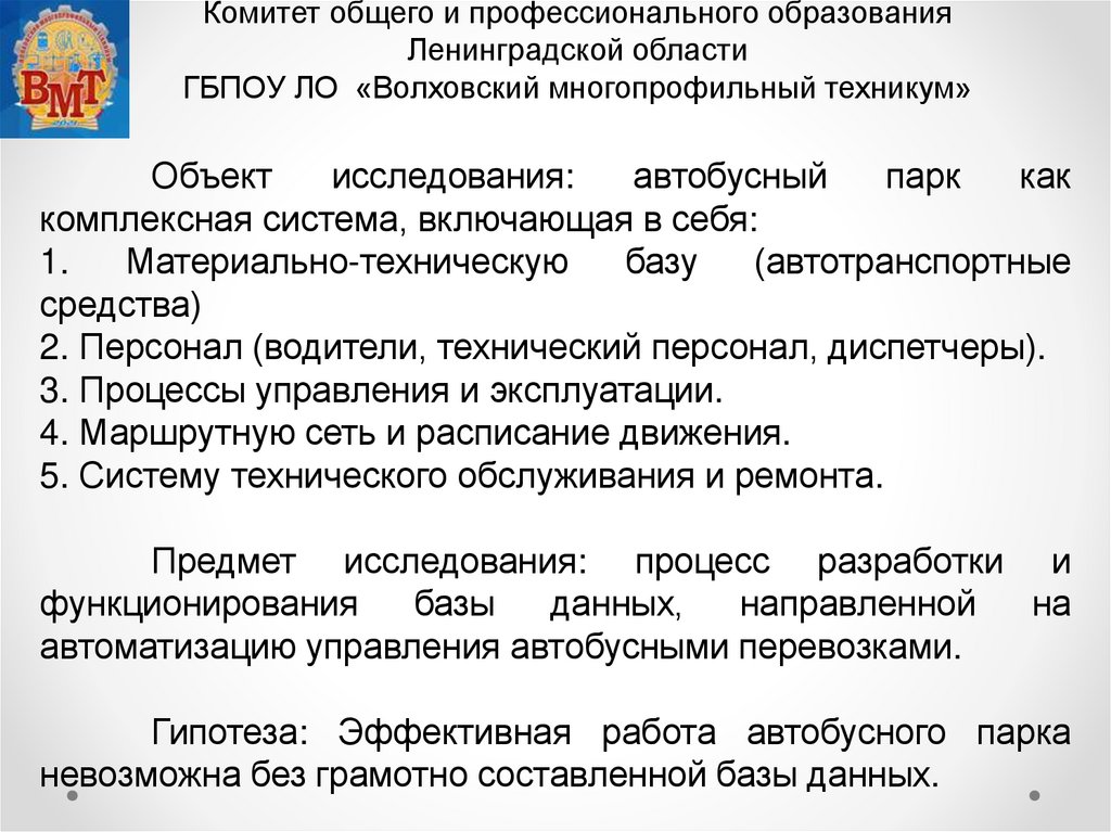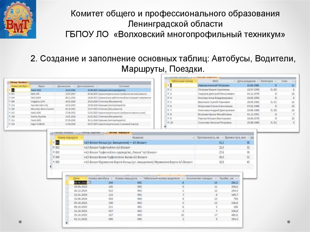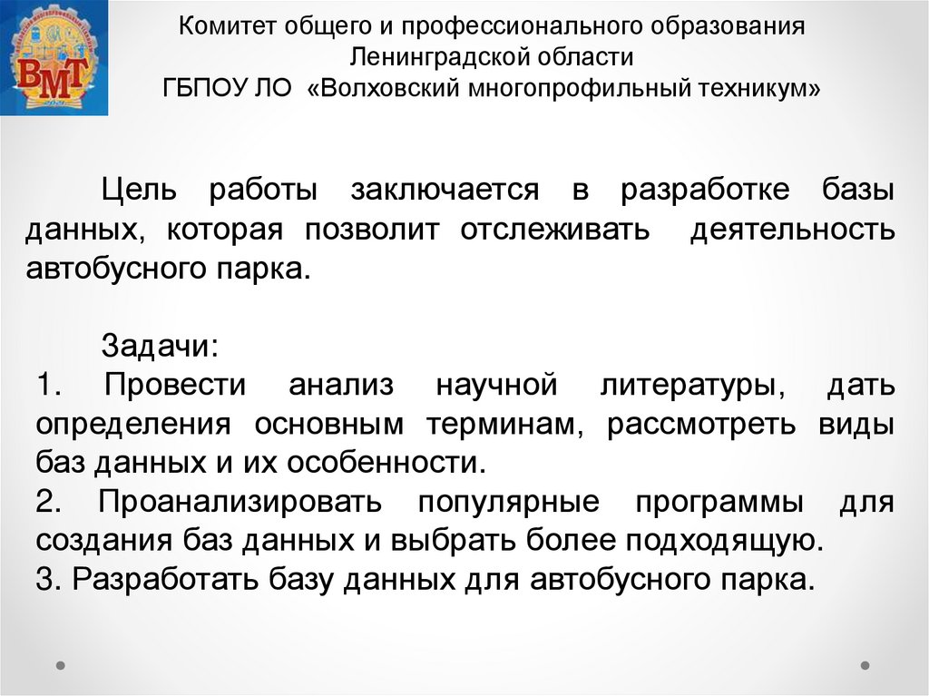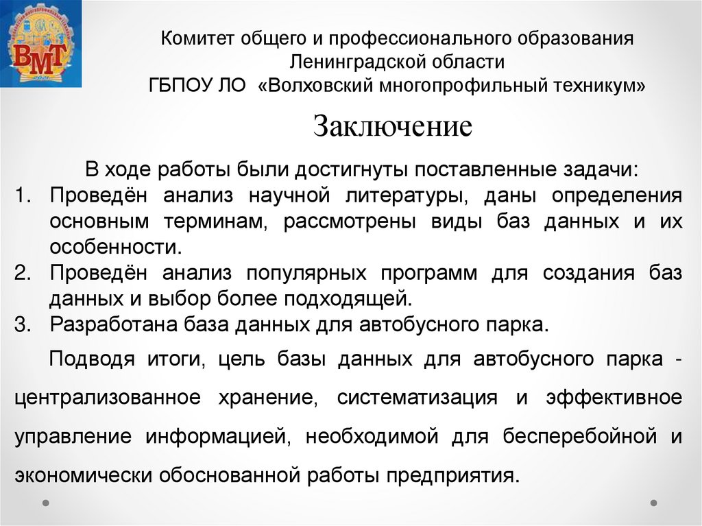 Подводя итоги, цель базы данных для автобусного парка централизованное хранение, систематизация и эффективное