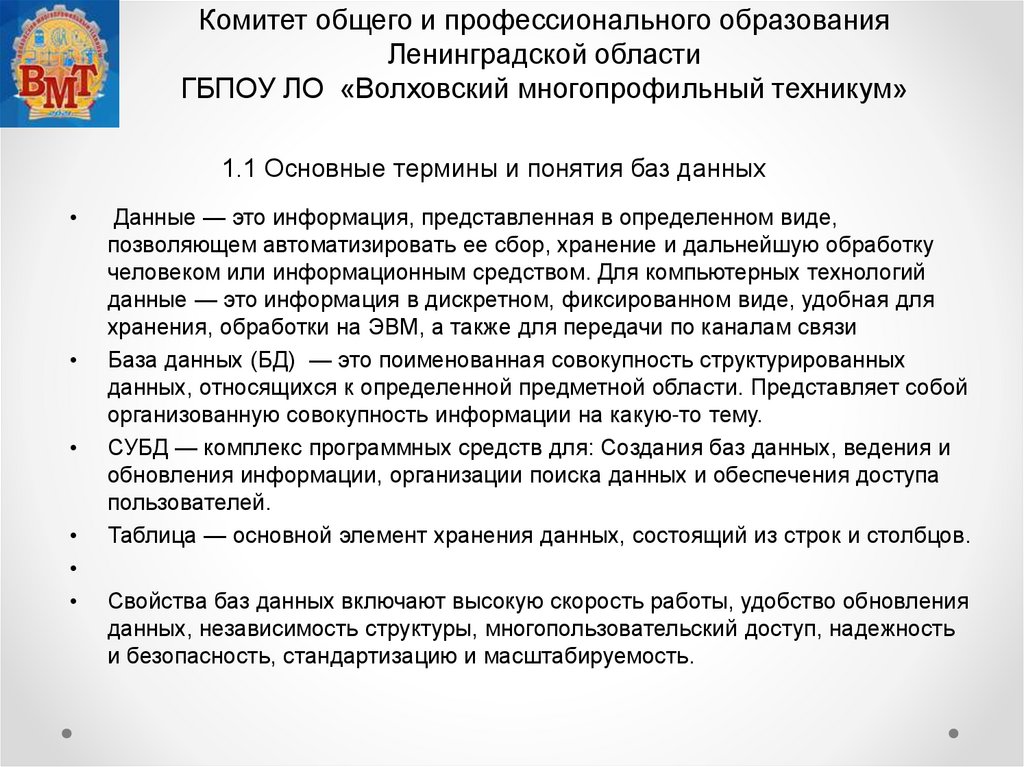 Свойства баз данных включают высокую скорость работы, удобство обновления