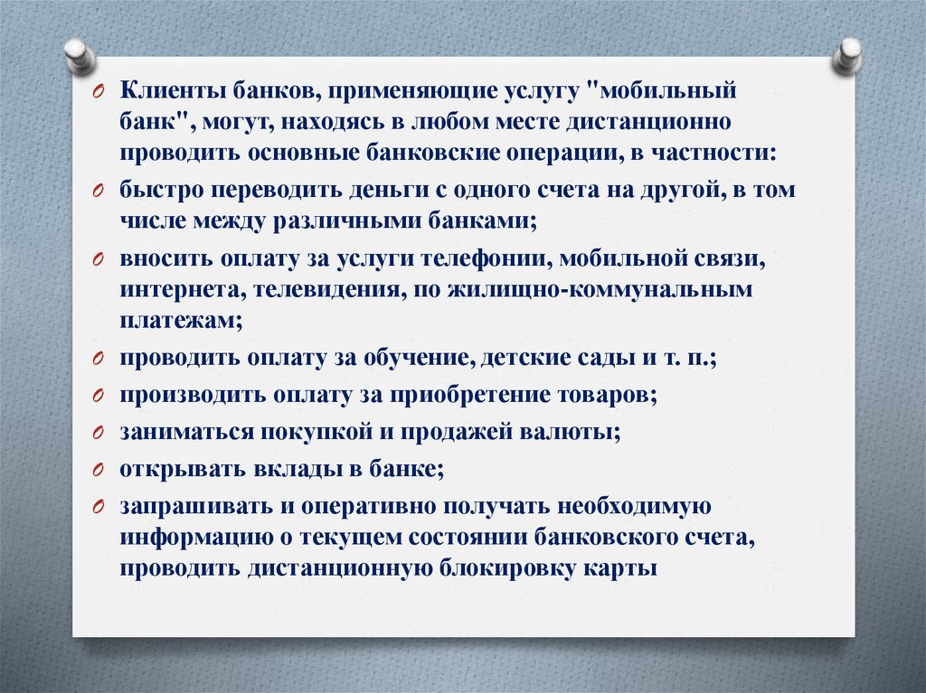O Клиенты банков, применяющие услугу "мобильныйбанк", могут, находясь в любом месте дистанционно