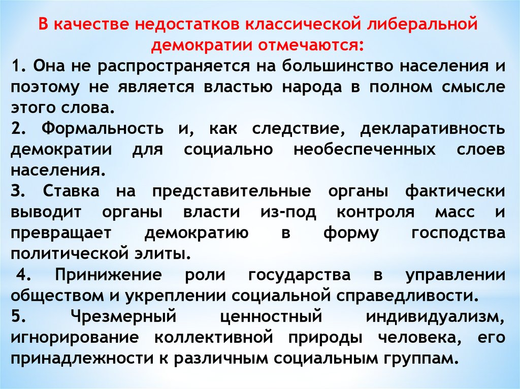 В качестве недостатков классической либеральнойдемократии отмечаются: