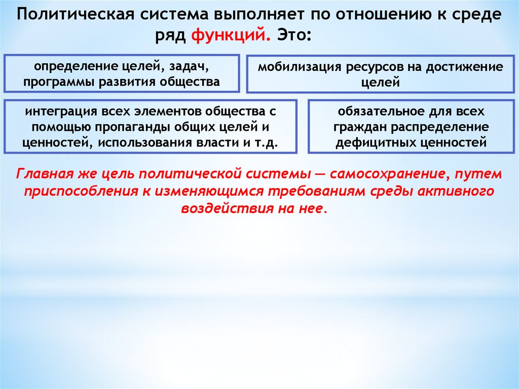 Политическая система выполняет по отношению к средеряд функций. Это: