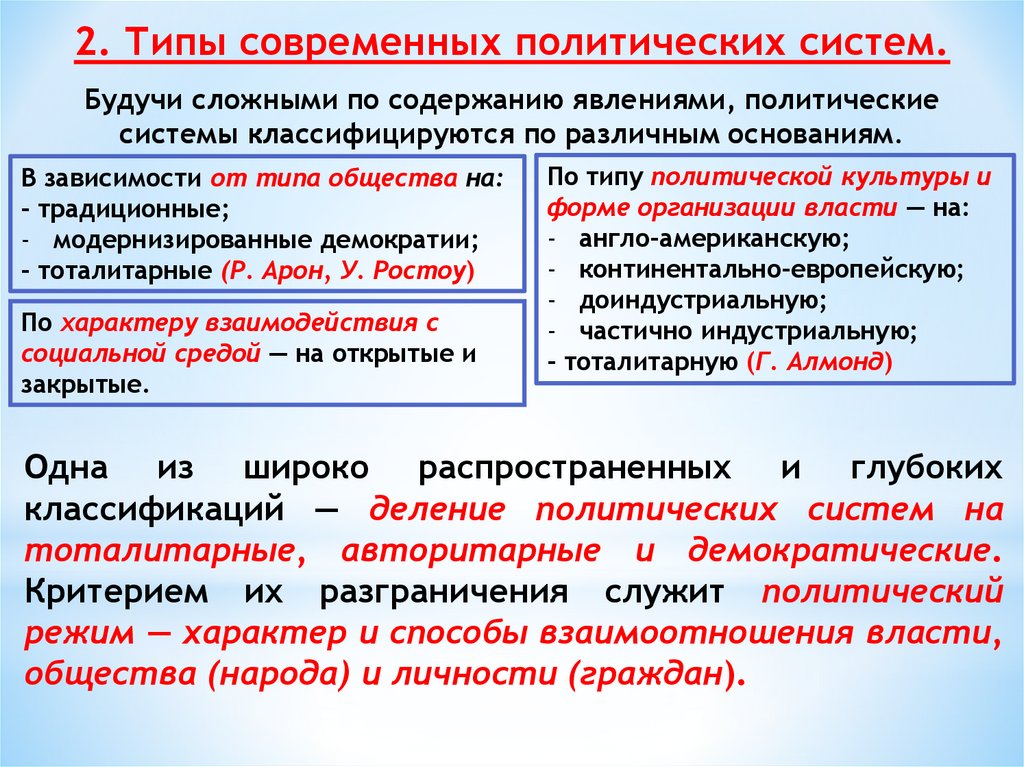 2. Типы современных политических систем.Будучи сложными по содержанию явлениями, политические